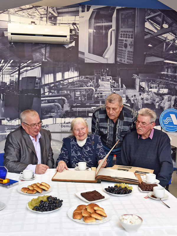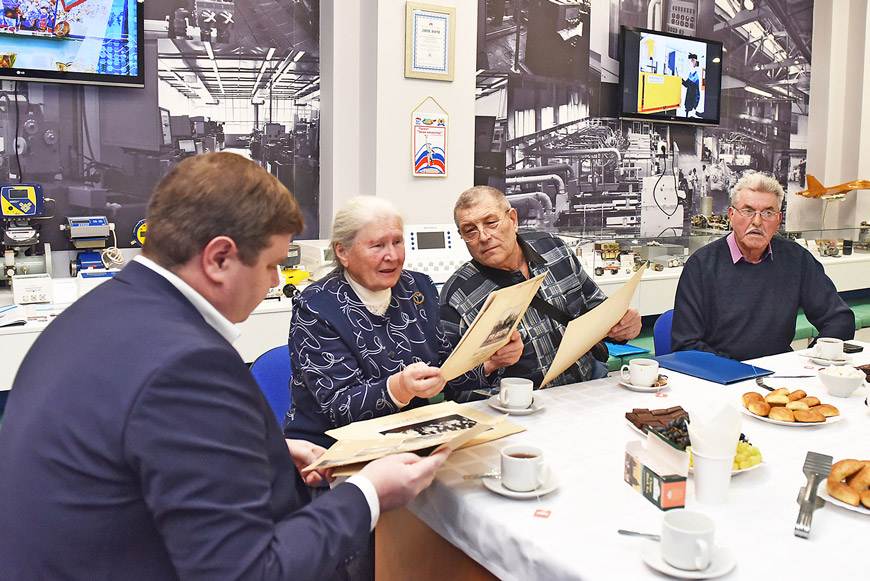 Фотоальбом рассматривают: выпускник ТУ № 5, ветеран АПЗ Иван Кирилин, заместитель директора по учебно-воспитательной работе ТУ № 5 Валентина Шумкова, мастер производственного обучения ТУ № 5, ветеран АПЗ Владимир Астафьев и выпускник ТУ № 5, начальник электротехнического участка АПЗ Александр Дмитриев