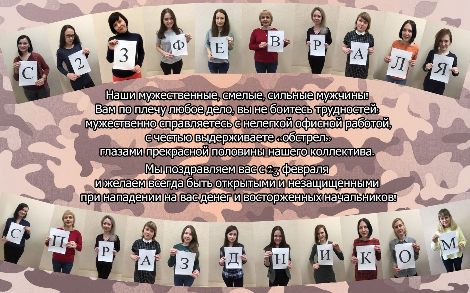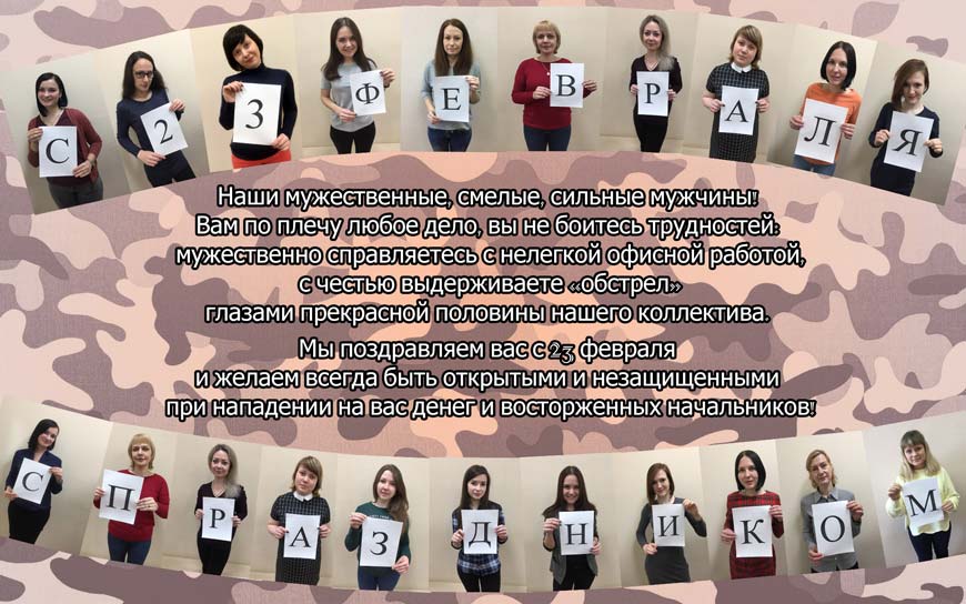 Дорогие мужчины! Поздравляем вас с Днём защитника Отечества! Желаем бодрости духа, отличного здоровья, тепла и уюта в семьях! Пусть будни не будут серыми, работа радует новыми свершениями и отличными результатами. Счастья вам!