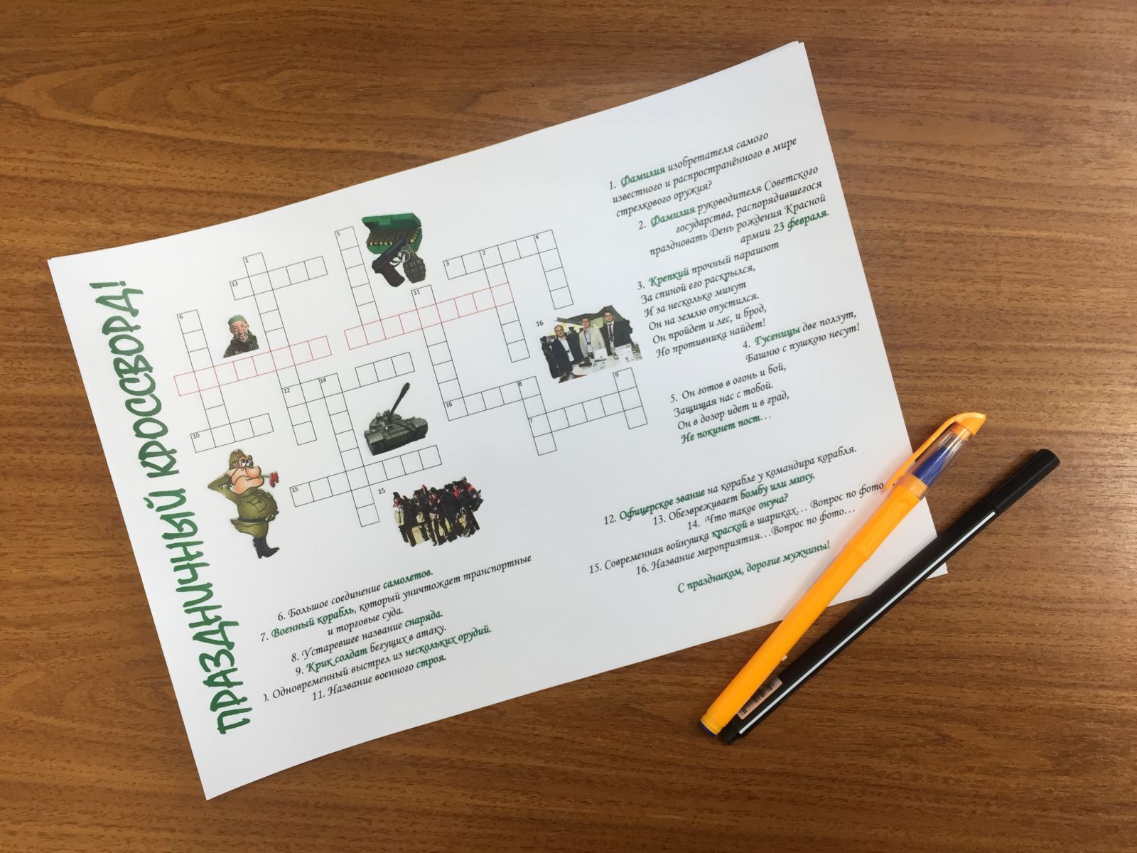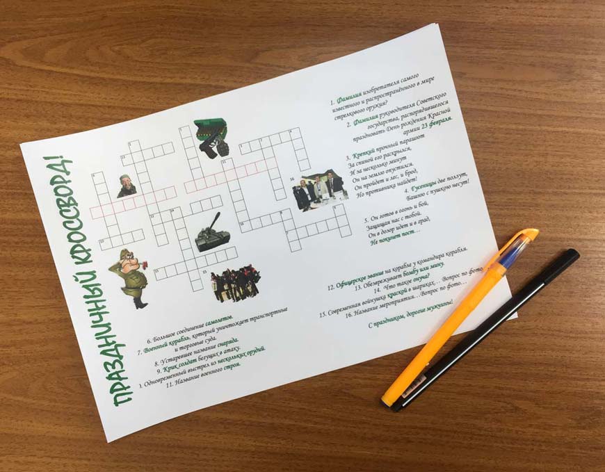 Девушки и дамы из ООО «Арзамасское приборостроительное конструкторское бюро» подготовились к поздравлению мужчин заранее. Последний рабочий день на этой неделе – 22 февраля – преподнесёт сильной половине коллектива АПКБ несколько сюрпризов. К примеру, им, хочешь не хочешь, придётся разгадать праздничный кроссворд, который составили специально для этого дня (если хотите, можете тоже попробовать).