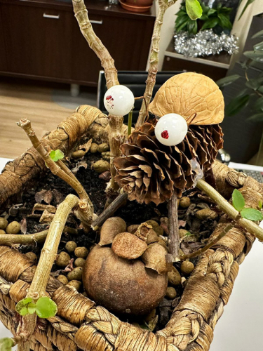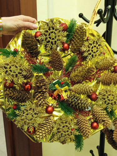 В общем, для украшений использовали в основном природный материал – сосновые и еловые шишки, жёлуди, ветки. Добавили немного декора в виде бусин и мишуры.