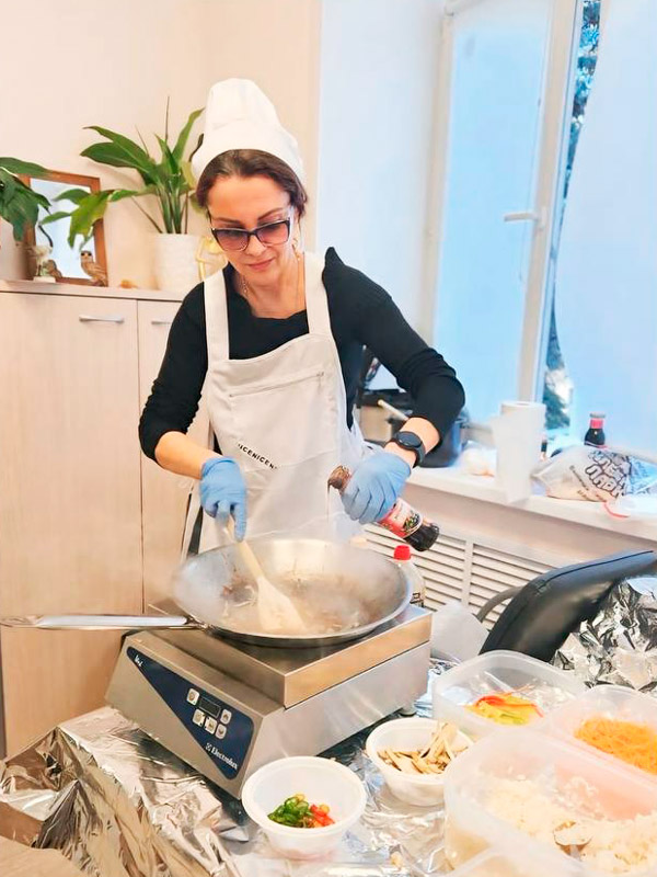 Женская часть коллектива порадовала мужчин вкусным воком с лапшой, рисом и разнообразными добавками на выбор. Те из мужчин, кто хотел проявить свои кулинарные навыки, смогли приготовить вок самостоятельно, остальные доверили приготовление блюда «Адскому шефу» в лице гендиректора компании Екатерины Латынцевой.