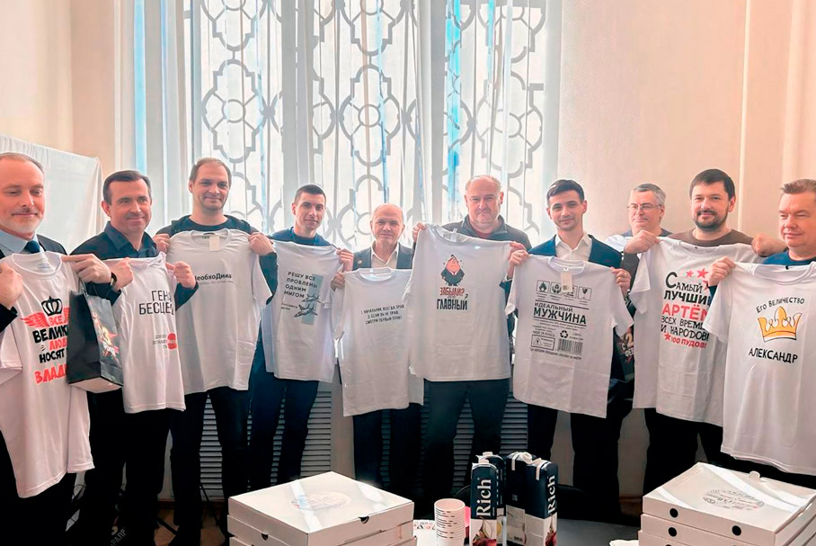 Кроме видеосюрприза, мужчинам вручили именные подарки: футболки, блокноты, ручки и термосы, каждый из которых был оформлен с индивидуальным подходом и особым смыслом.