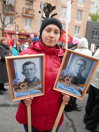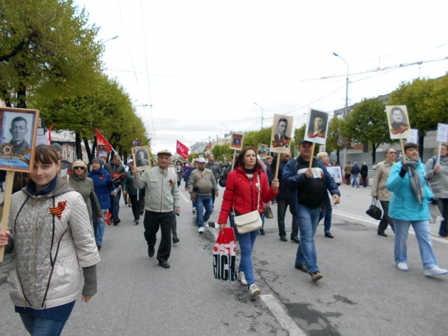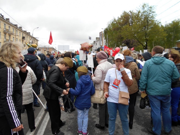 Шествие прошло несколько километров по Первомайскому проспекту от пересечения с улицей Вокзальной до площади Соборной перед Кремлем, где были устроены гуляния. На всем пути следования стояли зрители, некоторые также с портретами и фотографиями. Ветеранам, присутствовавшим на параде, дарили цветы, благодарили. Неподалеку от нас шел мальчик лет шести, ставший настоящим заводилой. Все время шествия он скандировал поздравления, пел и очень поднимал настроение окружающим.