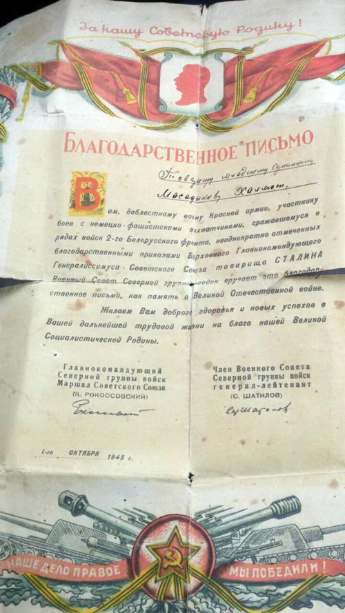 • Благодарственное письмо за подписью Главнокомандующего Рокоссовского от 01. 10. 1945 года.