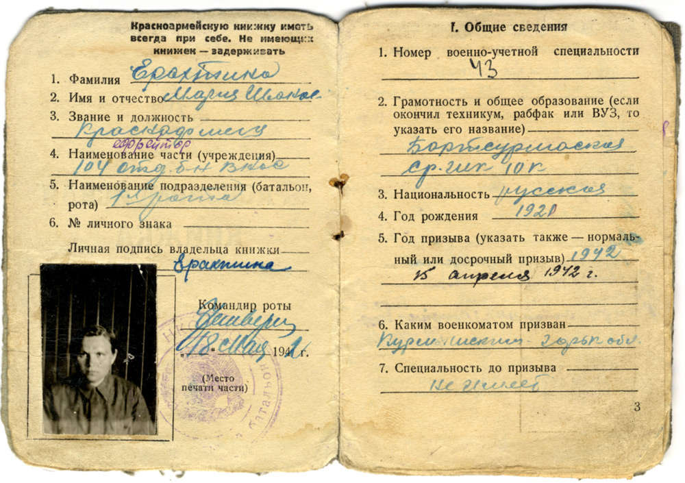 Вот такой видим мы на фотографии армейской книжки, датированной 18 мая 1942 года, ветерана Великой Отечественной войны, бывшую работницу Арзамасского приборостроительного завода Марию Ивановну Ерахтину. Ей здесь всего 18 лет.