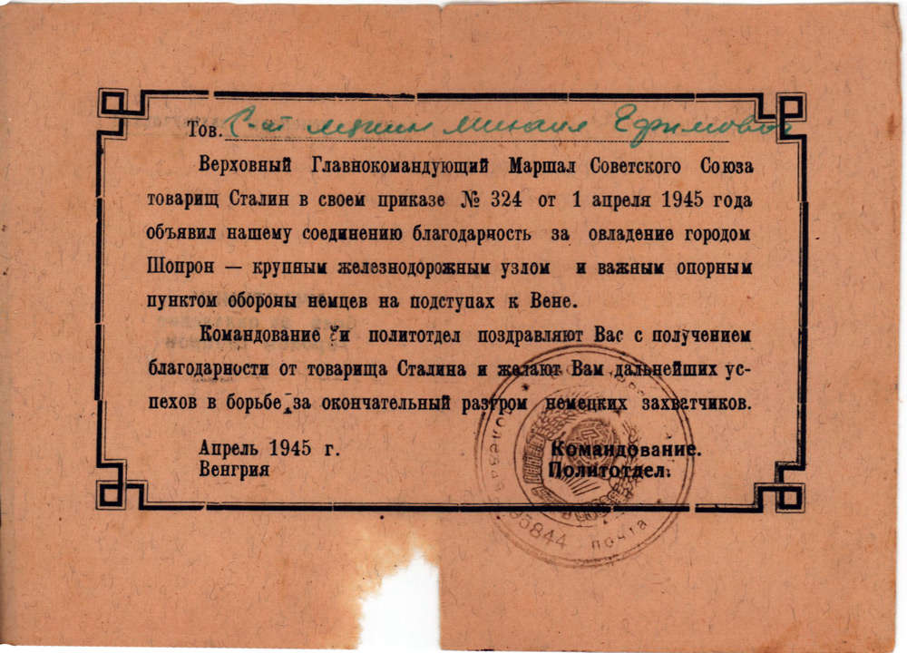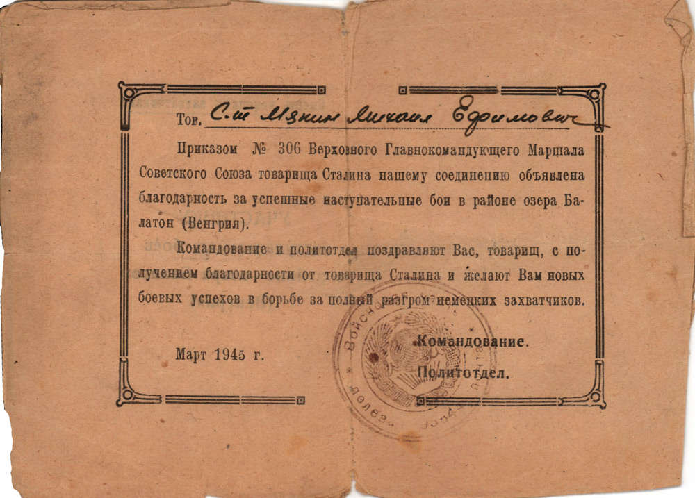 В планшете времён Великой Отечественной войны бережно хранились благодарности командования сержанту Мякину: «…за отличные боевые действия по овладению столицей Венгрии», «Благодарность Верховного Главнокомандующего, Маршала Советского Союза товарища Сталина» за участие в боях за Вену. Здесь же комсомольский билет, вручённый 17-летнему Михаилу в военном 43-м, купоны на денежные выдачи к удостоверению о награждении медалью (от 1944 года), удостоверение об окончании Горьковской школы радиоспециалистов, датированное июлем 1943 года.