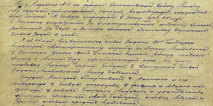 Вместе со своими боевыми товарищами он уничтожил несколько десятков артиллерийских батарей, огневых точек и других огневых средств противника.