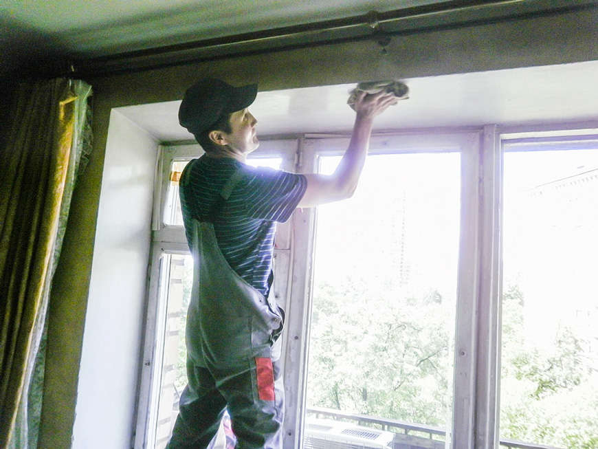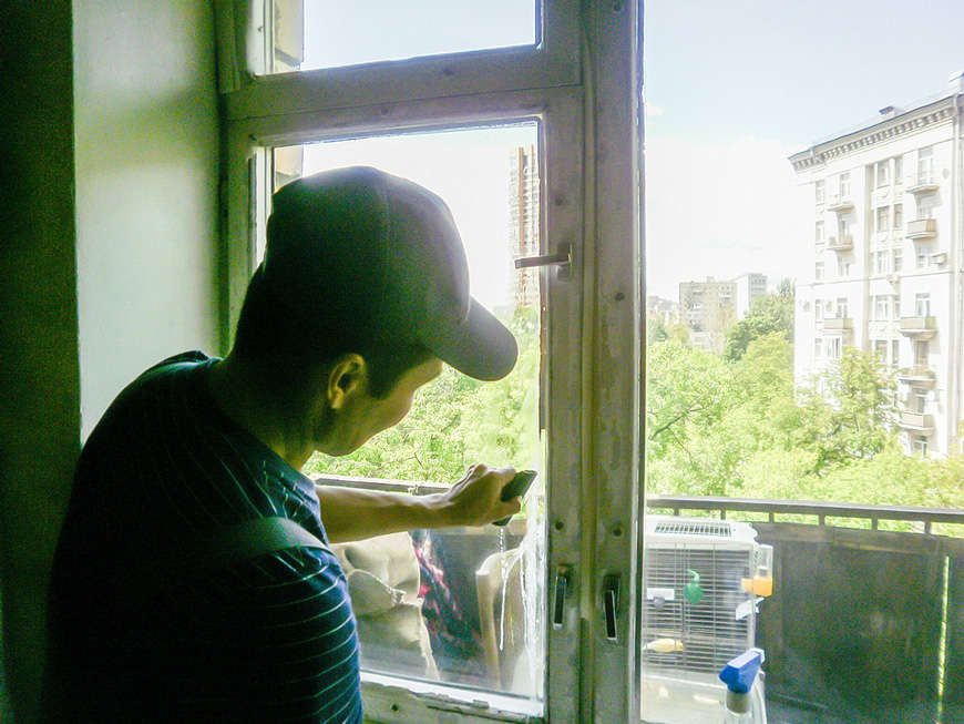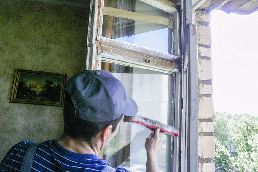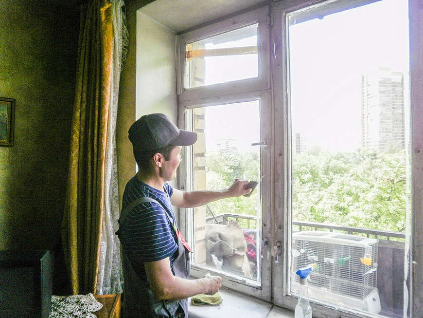 Сотрудники службы клининга ГК «СОЦИУМ» моют окна в квартирах пожилых людей.