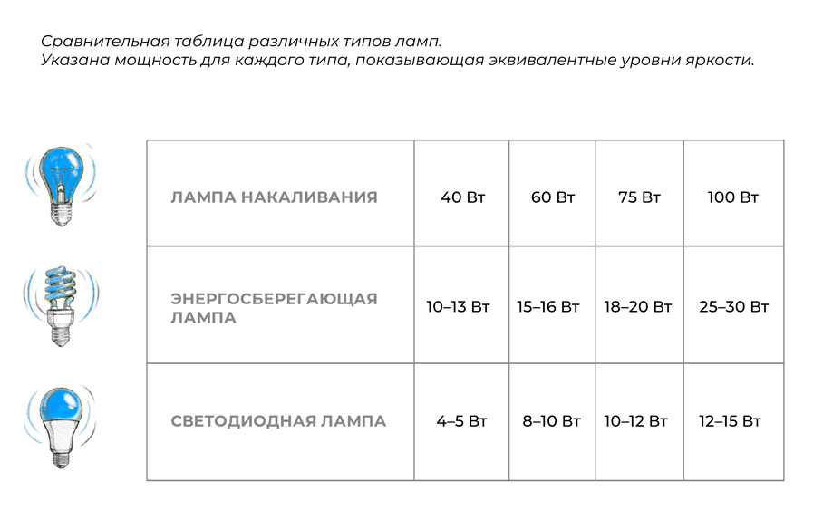 При покупке выбирайте лампы «с запасом». Если вам нужно заменить 40-ваттную лампочку, берите ту, на которой написано «эквивалент лампы накаливания 60 Вт». Многие производители указывают на упаковках ламп завышенные параметры.