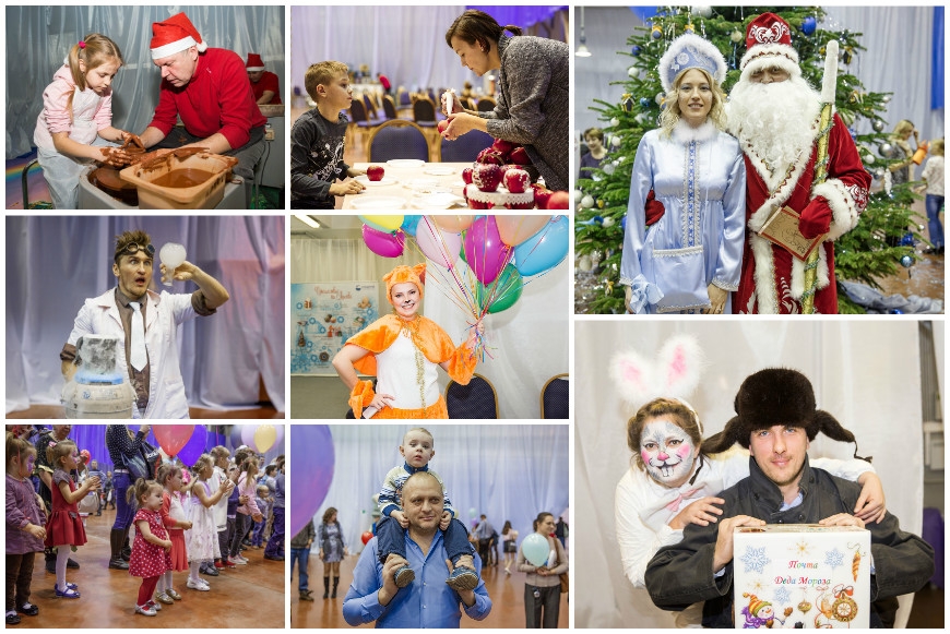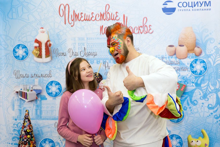 Праздничное настроение задавали ещё на входе аниматоры. Добрый молодец встречал гостей на пороге, развлекая переодевающихся малышей. Шуточные перебранки то с Петушком (символом наступающего года), то с Бабой Ягой веселили и детей, и взрослых. Внимательно рассмотрев огромную карту праздника с символом «СОЦИУМА» и перечнем мастер-классов, гости праздника направлялись наконец в зал.