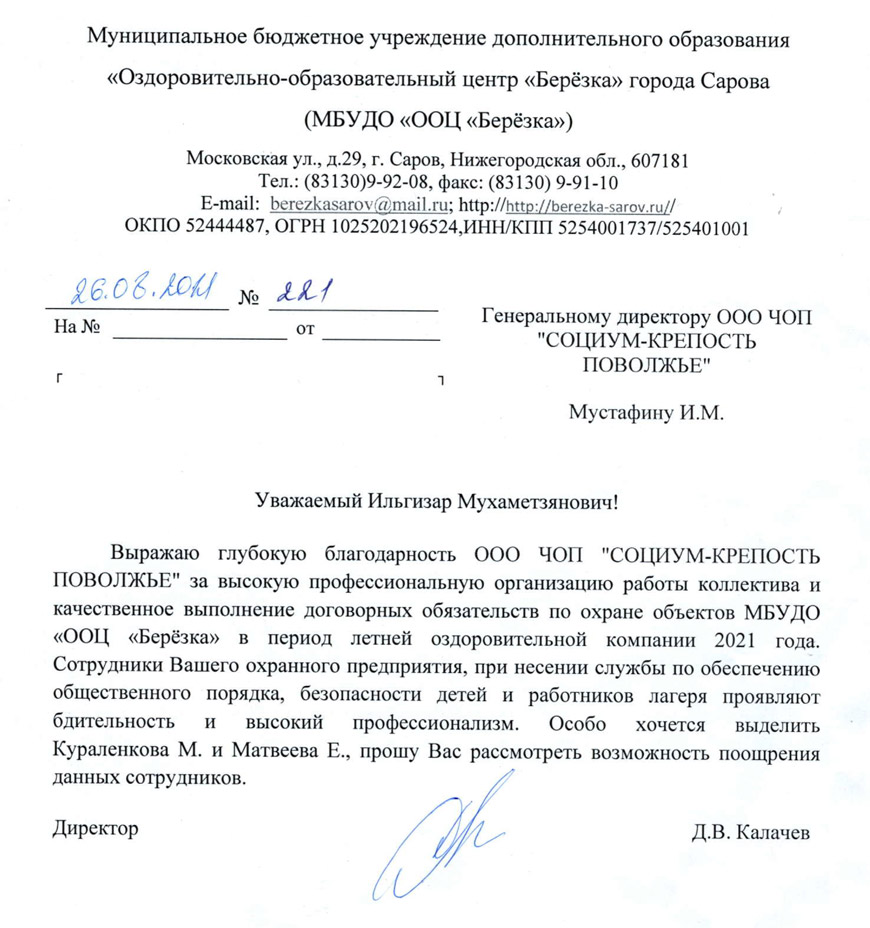 О безопасном и наполненном событиями отдыхе для более 600 детишек в возрасте от 7 до 13 лет этим летом хорошо позаботились детский лагерь «Берёзка» города Сарова и сотрудники ООО ЧОП «СОЦИУМ-КРЕПОСТЬ Поволжье».