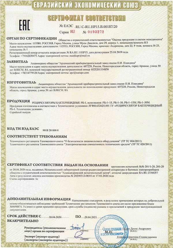 Бактерицидный рециркулятор РБ-1 производства Арзамасского приборостроительного завода получил сертификат соответствия Евразийского экономического союза. Маркировка ЕАЭС нанесена на паспорт изделия.