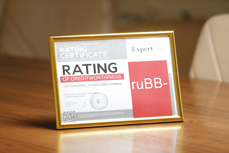 «Эксперт РА» – это ведущее рейтинговое агентство в России, а его оценка деятельности считается авторитетной на финансовом рынке и среди участников банковского сектора России. Рейтинг на уровне ruВВ- отражает достаточно устойчивое положение «СОЦИУМ-БАНКА», его финансовое состояние, достаточность капитала, наличие базы фондирования.