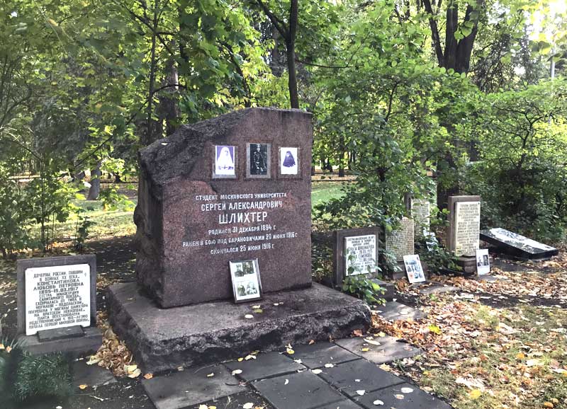 В 40-е годы мемориальное кладбище фактически сровняли с землёй. До нашего времени сохранилось лишь одно надгробие – Сергею Шлихтеру. Молодой человек погиб под Барановичами и завещал похоронить себя рядом с подругой, Ольгой Шишмарёвой. Девушка была первой сестрой милосердия, которую похоронили на Братском кладбище. Существует легенда, что снести надгробие на могиле помешал отец Сергея, Александр Шлихтер, который был видным политическим деятелем в СССР.