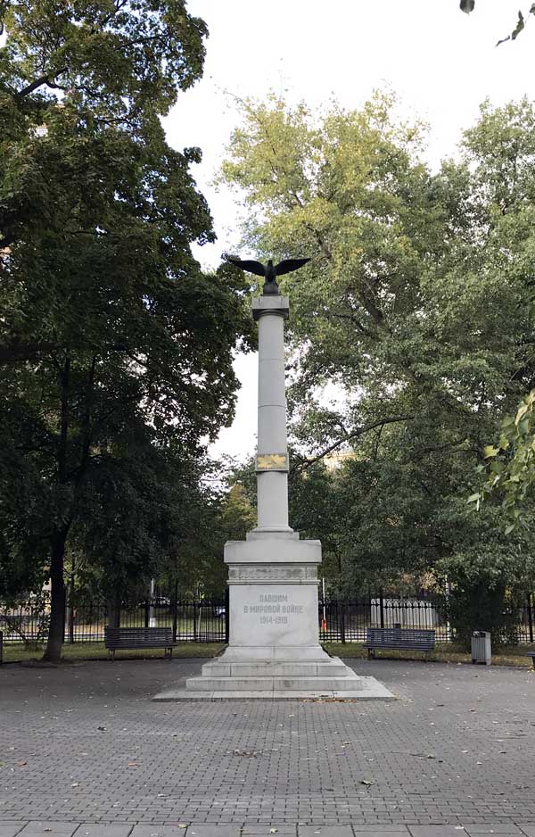У начала центральной аллеи посетители парка видят каменную колонну, увенчанную парящим орлом. На массивном пьедестале надпись: «Павшим в Мировой войне 1914 года».