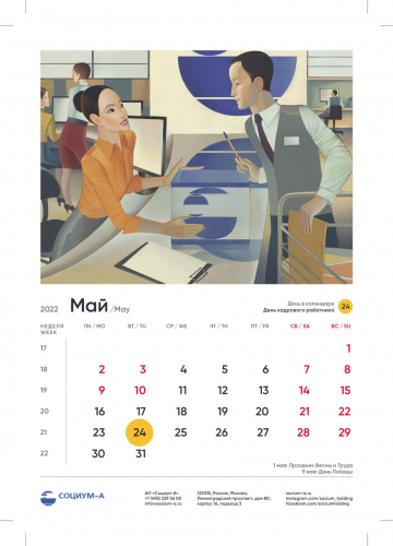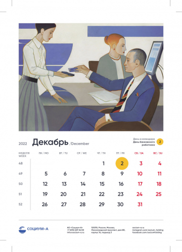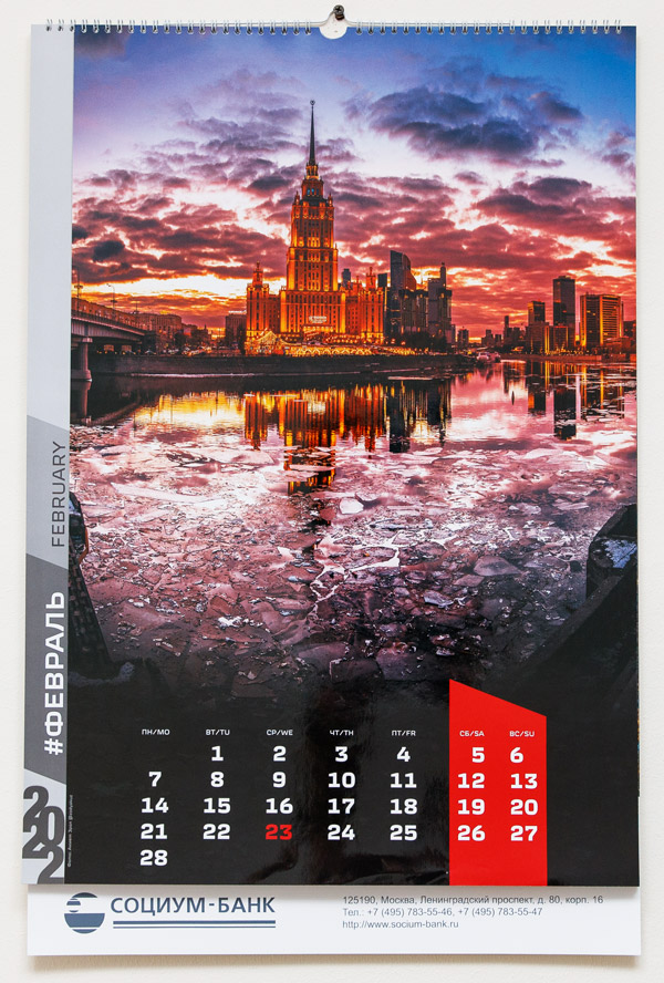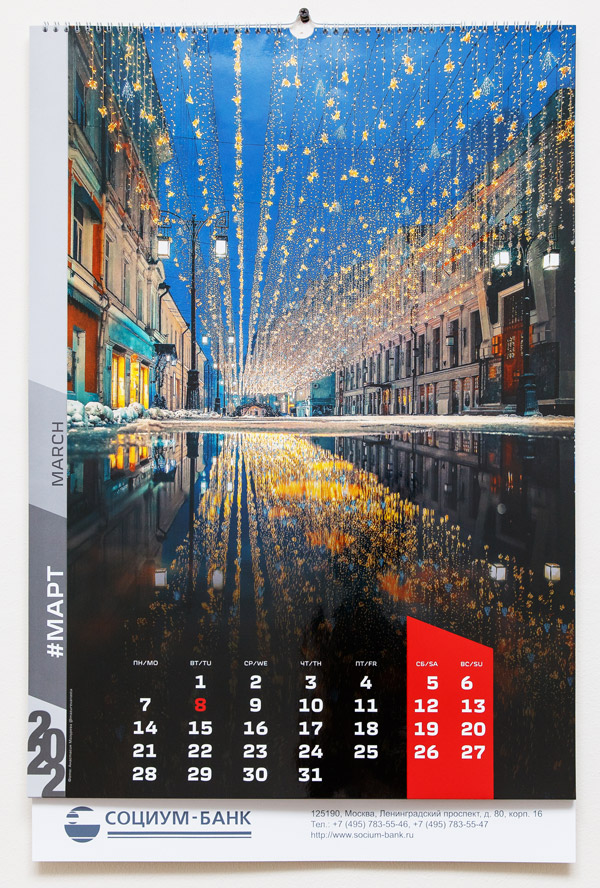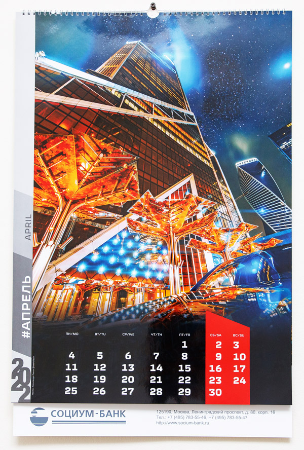 В прошлом году у нас были календари на тему «Фаберже», так как 2021-й был юбилейным для этого ювелирного бренда. До этого – «Есенин», что связано с юбилеем поэта. В этом году 875 лет Москве. Поэтому было принято решение показать красоту столичной архитектуры. Вот так появился наш календарь на 2022 год. Корпоративный календарь «СОЦИУМ-БАНКА» украшают 12 красочных фотоиллюстраций с видами Москвы, выполненными профессиональными фотохудожниками.