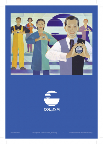 – Девиз компании «Большое – в малом, малое – в большом» вызвал у меня ассоциации с преломлением масштабов предметов в увеличительном стекле, – вспоминает Леонид. – Тогда родилась первая «пилотная» иллюстрация с двумя учёными и колбой в стилистике журнальной графики 60‑х годов. Далее многообразие деятельности «СОЦИУМА» подтолкнуло к общей концепции соединения в картинке какой-то профессии и обыгрывания совмещения на разных планах логотипа, как и в «пилотной» иллюстрации. Но для разнообразия рисунков для некоторых композиций пришлось расширить стилистику и отойти от графики а ля 60‑е. Так появились картинки и в более современной манере, и, наоборот, в манере 20‑х годов.