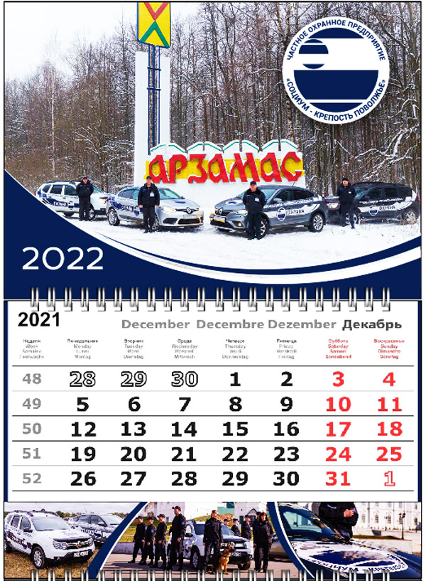 Изготовление календаря доверили местной типографии. Несмотря на то, что на рынке сувенирной продукции за последние годы появилось много новомодных штучек, но брендированный календарь – по-прежнему лучший способ для саморекламы. В этом уверен генеральный директор ЧОП «СОЦИУМ-КРЕПОСТЬ ПОВОЛЖЬЕ».