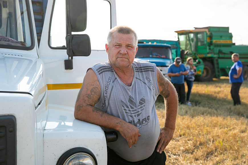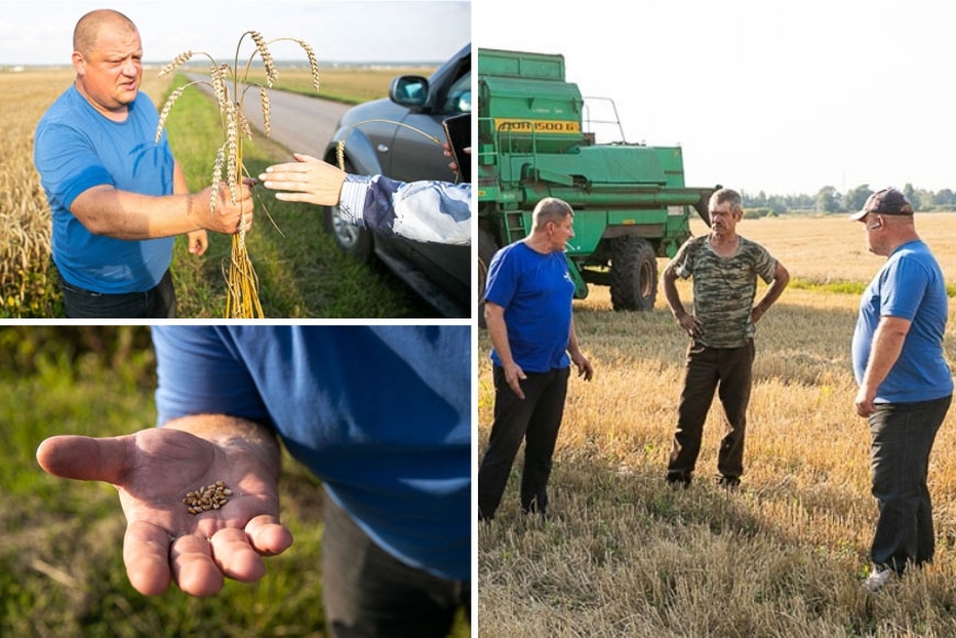 Приближается первый остановочный пункт. Издалека видны несколько мощных машин, выписывающих под рёв моторов замысловатые фигуры. Здесь идёт уборка ячменя. В поле три зерноуборочных комбайна – 1500 Б и два белорусских «Полесья», за которыми следует трактор с пресс-подборщиком. Рядом с комбайном грузовик, куда стекает зерно.