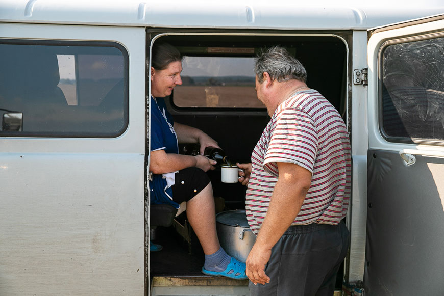 Каждое утро комбайнёры не менее двух часов тратят на подготовку и техобслуживание своих машин. А потом целый день до заката проводят в кабине, из которой выходят только на обед и на полдник, которые доставляют прямо в поле, или в случае поломки.