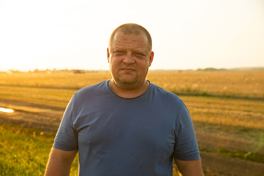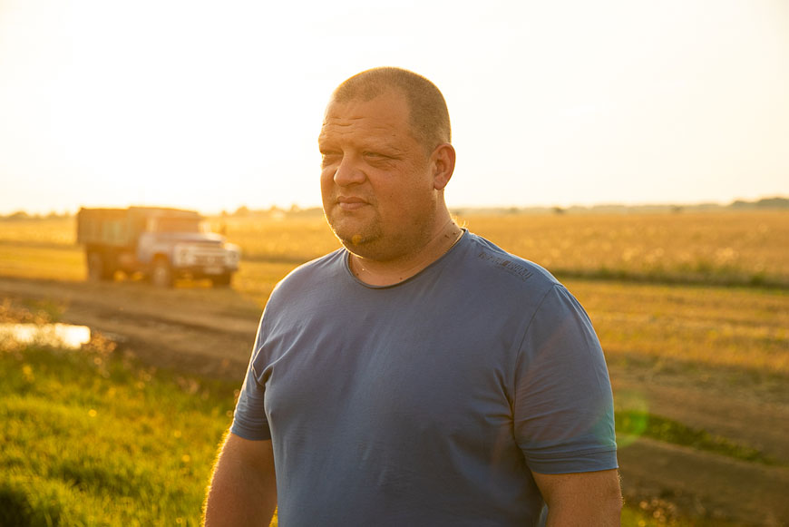 По дороге перехватили главного инженера ООО «СОЦИУМ-АГРО» Евгения Баранова. Он передал нам новенький шланг, который мы доставили механизатору Юрию Елисееву. Юрий на полевых работах занят с 16 лет. Сейчас ему 60…