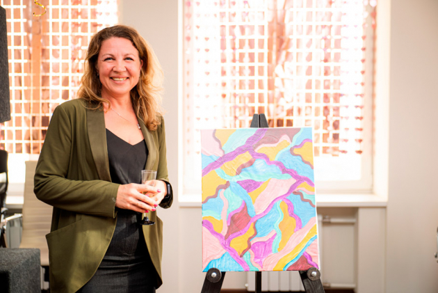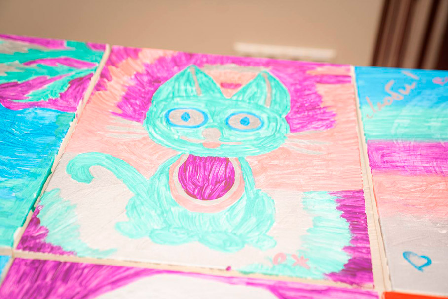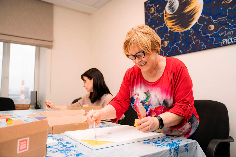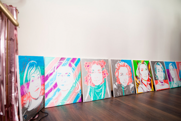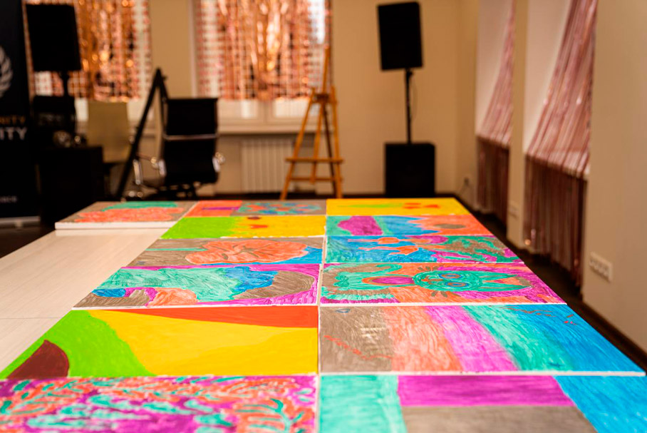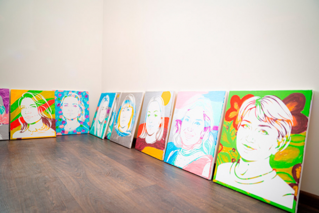 Сотрудниц пригласили поучаствовать в творческом процессе. Каждая рисовала что-то своё: кто цветок, кто абстракцию, а кто-то – котика. Дамы не догадывались, что их рисунки станут фоном для портретов коллег.