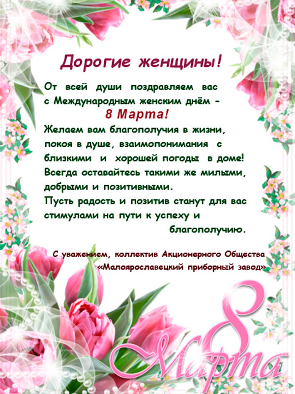 «От имени руководства и мужской части коллектива поздравляю вас с прекрасным весенним праздником, Международным женским днём.