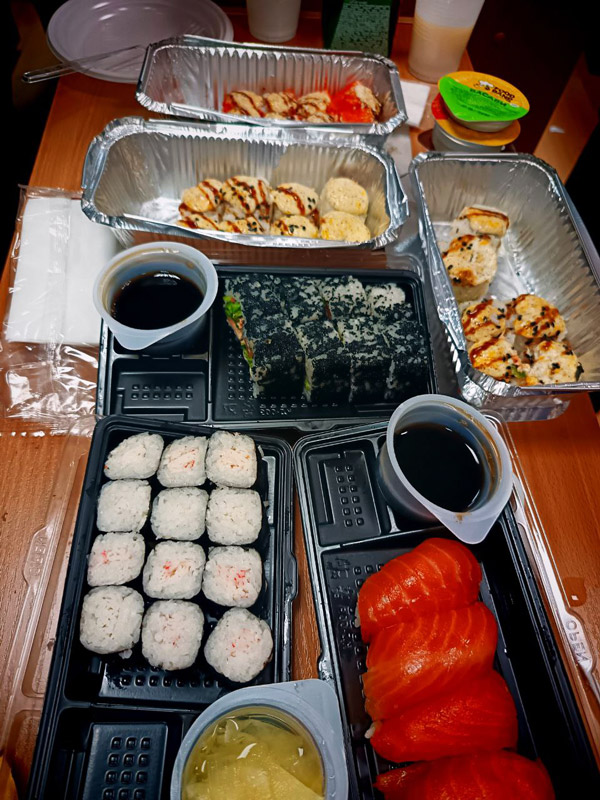 Мужчины из технических служб «МОСКВА-СОКОЛ» и «СОЦИУМ-ЭНЕРГОСИСТЕМЫ» под руководством М. Ю. Зубова – суровые парни. Но если вопрос касается милых дам, они расцветают. Приятные слова и подарки, вкусные суши и роллы ждали женщин в этот день, накануне 8 Марта!