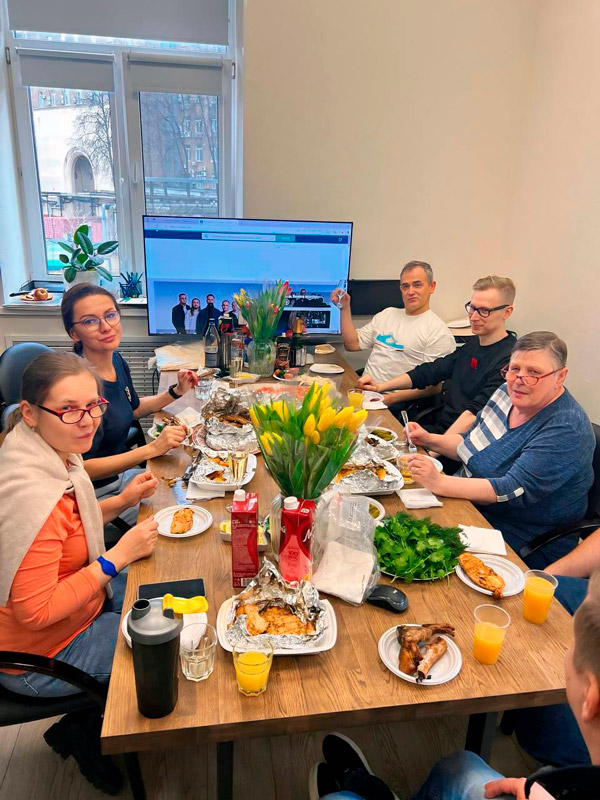 Праздник в небольшом коллективе «СОЦИУМ-ЭНЕРГО» прошёл по-семейному. Генеральный директор В. Г. Дереш и инженер Олег Родиюк собственными руками приготовили праздничные угощения, вручили дамам цветы и подарки.