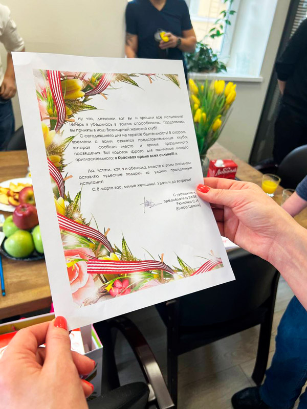 В «СОЦИУМ-ТЕЛЕКОМ» подарки никогда не достаются просто так, даже за красивые глаза. В этот раз девушек пригласили на праздничный фуршет, где их ждали не только угощения, но и увлекательный квест. Каждая участница получила задание, которое нужно было выполнить, чтобы приблизиться к главному сюрпризу – праздничному столу. А завершилось мероприятие всеми любимым караоке!