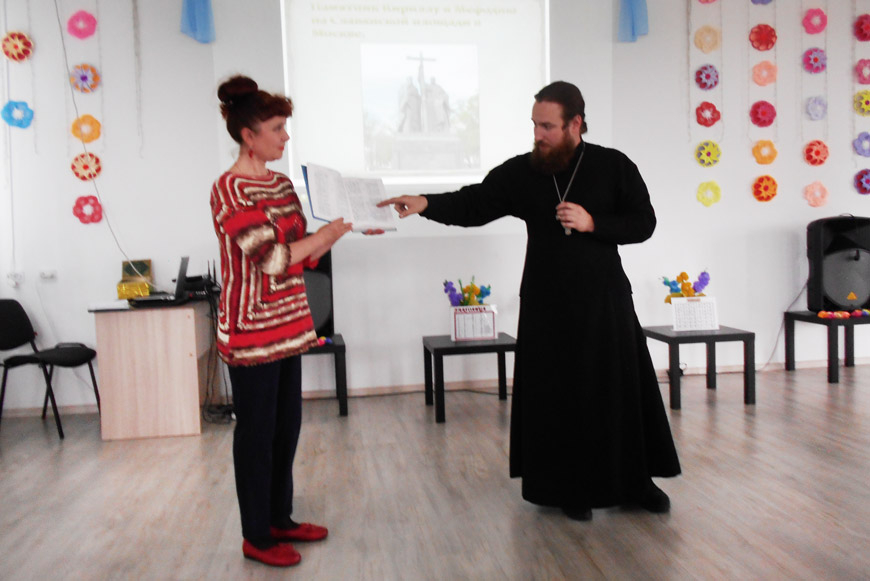 Отец Александр Жарков, настоятель храма в честь Усекновения Честной главы Иоанна Предтечи, объяснил присутствующим, что благодаря двум учёным – грекам Кириллу и Мефодию, изменившим греческую азбуку, чтобы более точно передать славянскую языковую систему, был создан церковно-славянский язык, который сегодня объединяет все славянские народы. Именно на этом языке совершаются богослужения Православной церкви.