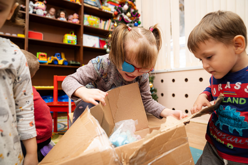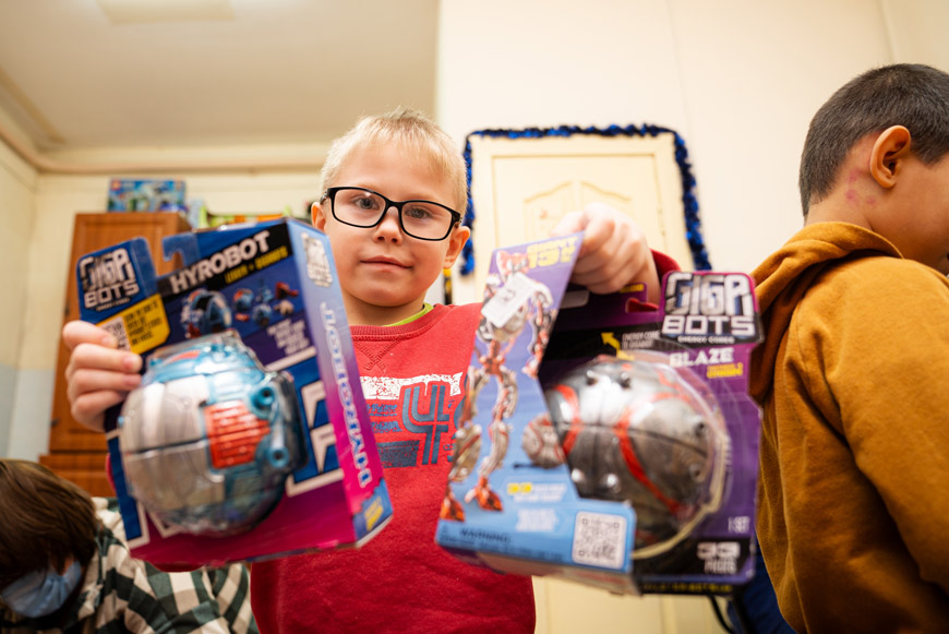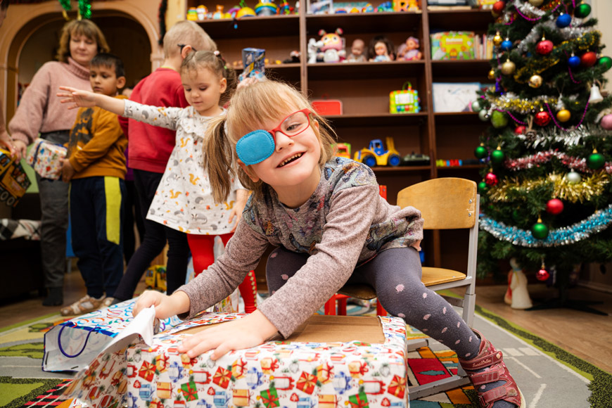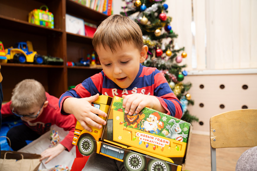 Мы немного пообщались с самыми маленькими – подпитались эмоциями. Помним свою поездку прошлого года, тогда некоторые из этих детишек ещё толком не умели ходить, сидели в своих кроватках. Очень подросли, похорошели. Научились быстро расправляться с упаковкой подарка, чтобы извлечь с нетерпением ожидаемое чудо.