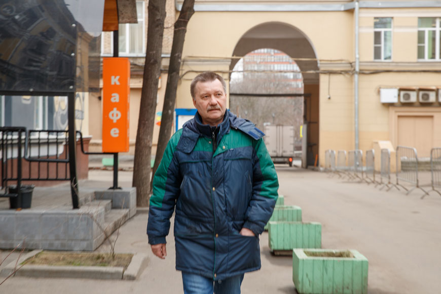 Он профессиональный строитель, на этой площадке уже 15 лет, знает все её особенности досконально и чувствует гордость за то, что к ней причастен, отвечает за ремонт помещений, кровель и фасадов, в том числе за вид на наш квартал, который открывается с Ленинградского проспекта.