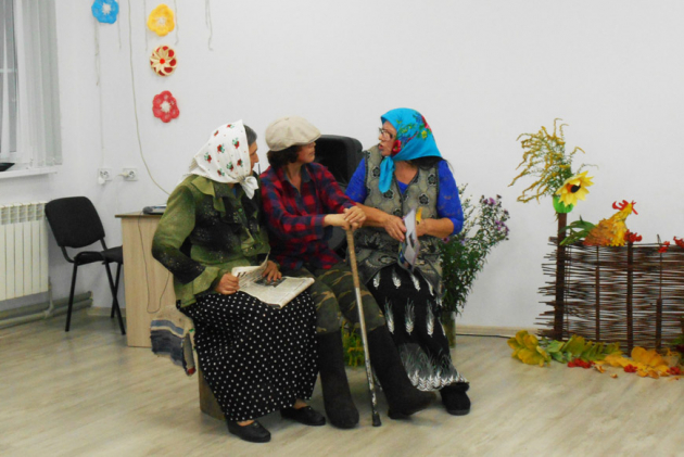Помимо вокальной программы (в селе петь очень любят), наши самодеятельные артисты подготовили несколько сценок – «Дед Федот», «Городская и деревенская», инсценировку песни «Задумал старый дед жениться». Из Натальи Хохряковой получился очень реалистичный Старый дед, Любовь Танкова смело сыграла Старую женщину, а Галина Пужаева – Молодую женщину. Кстати, дед Федот в другой сценке в исполнении Галины также был очень убедителен.