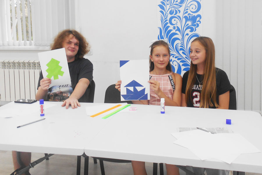 На русском языке, который оказался для ребят самым сложным предметом, соревновались в составлении слов из одного большого. На физкультуре выполняли приседания на носочках, а ещё – держа развёрнутую газету на вытянутых руках, зажав между коленями теннисный шарик и удерживая за спиной гантель. На математике решали задачи на скорость и измеряли ломаную линию линейкой, а затем все вместе создавали аппликацию из квадратов и треугольников.