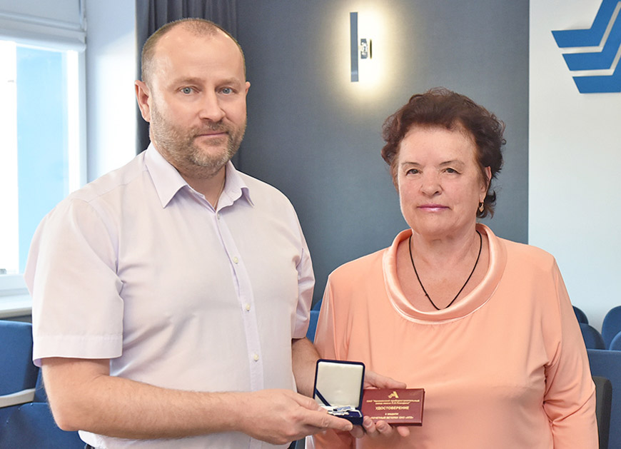 Медаль почётного ветерана труда АПЗ Татьяне Рожковой вручил генеральный директор Андрей Капустин. Фото Елены Галкиной