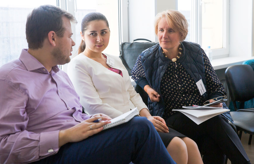 Обсуждение в группах: Александр Леонов, финансовый аналитик АО «СОЦИУМ-А», Анна Клименко, секретарь-референт ВЭС ВКС, Елена Щербакова, руководитель информационного департамента АО «СОЦИУМ-А»
