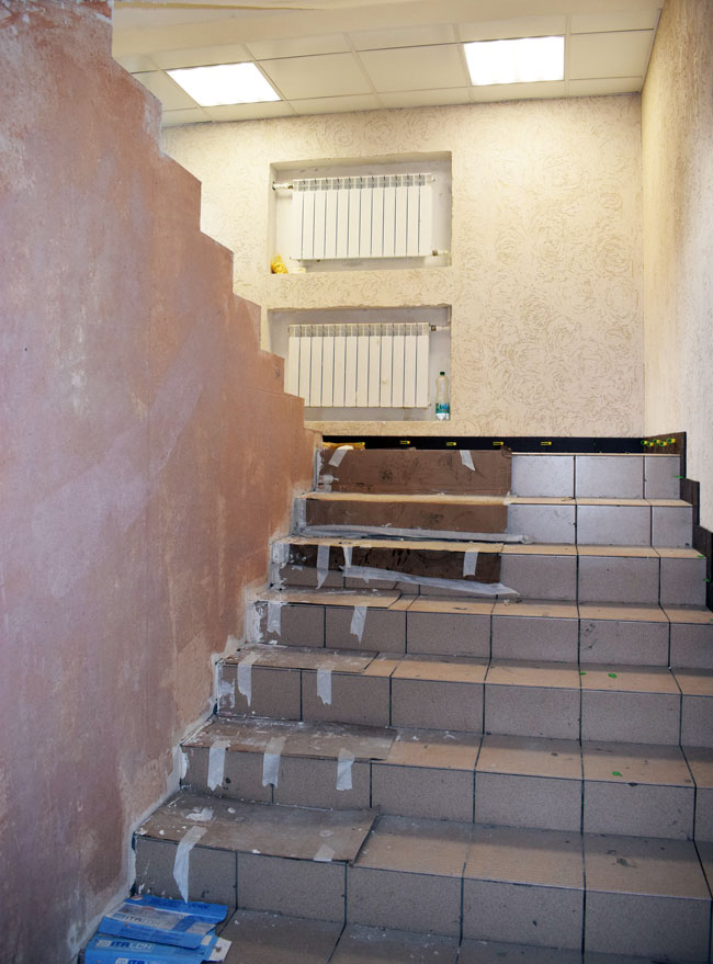 Во время ремонта секция была полностью реконструирована, ступени выровнены по высоте и ширине и покрыты нескользкой плиткой. Сейчас лестница радует глаз симметрией, и уже никому не приходится всякий раз аккуратно нащупывать ногой ступеньку, прежде чем наступить на неё.