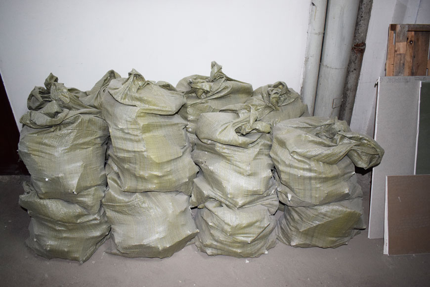 За полувековую службу пола на нём появились выбоины и небольшие трещины, но снять его удалось ценой огромных усилий. Даже упакованный в мешки для отходов старый пол смотрелся очень солидно.