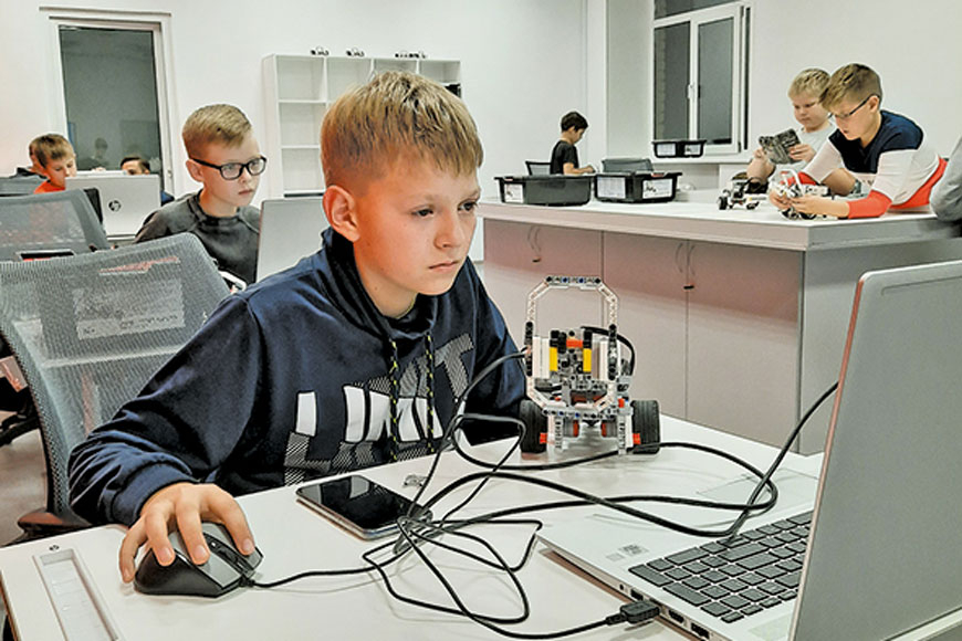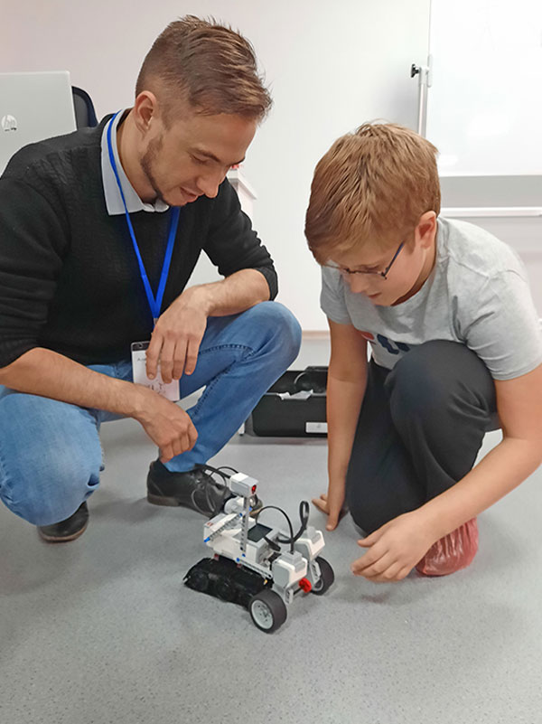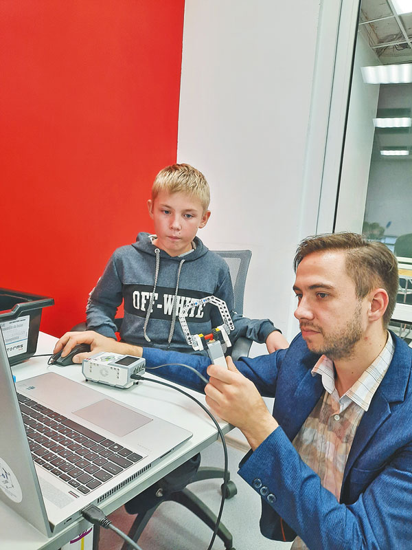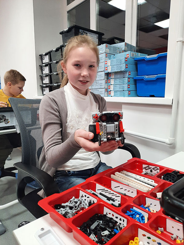 – Собираем различные модели: это может быть танк, машина, шагающий робот. В наборе есть блок управления, система датчиков и моторов. Задача ребят – всё соединить и составить программу, то есть прописать алгоритм действия робота. Ребёнок должен понимать, какой датчик опросить, на какой мотор отправить сигнал, чтобы машина начала двигаться. В итоге мы получаем механизм, который откликается на определённые воздействия (цвет, касание) и выполняет запрограммированные движения. Словами не описать тот восторг, который испытывают дети, когда у них всё получается. Сам заряжаешься от них этой чистой позитивной энергией.