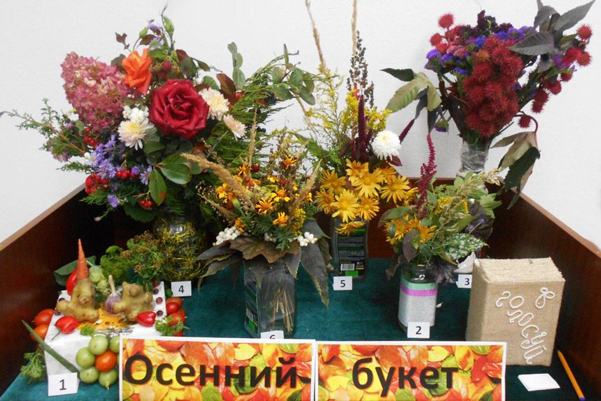 Использованы всевозможные природные материалы – дары осени. Цветов, ягод, зелени в хиринских садах ещё много. В вазе это смотрится очень красиво. Осенние цветы впечатляют яркими красками, и даже срезанные стоят долго, а некоторые потом превращаются в сухоцветы.
