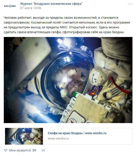 Посетители поставили 655 лайков, сделали 77 репостов и оставили 7 комментариев к постам на нашей странице. Более 500 лайков пользователи поставили на репостах анонсов журнала ВКС в популярных группах и оставили более 200 комментариев.