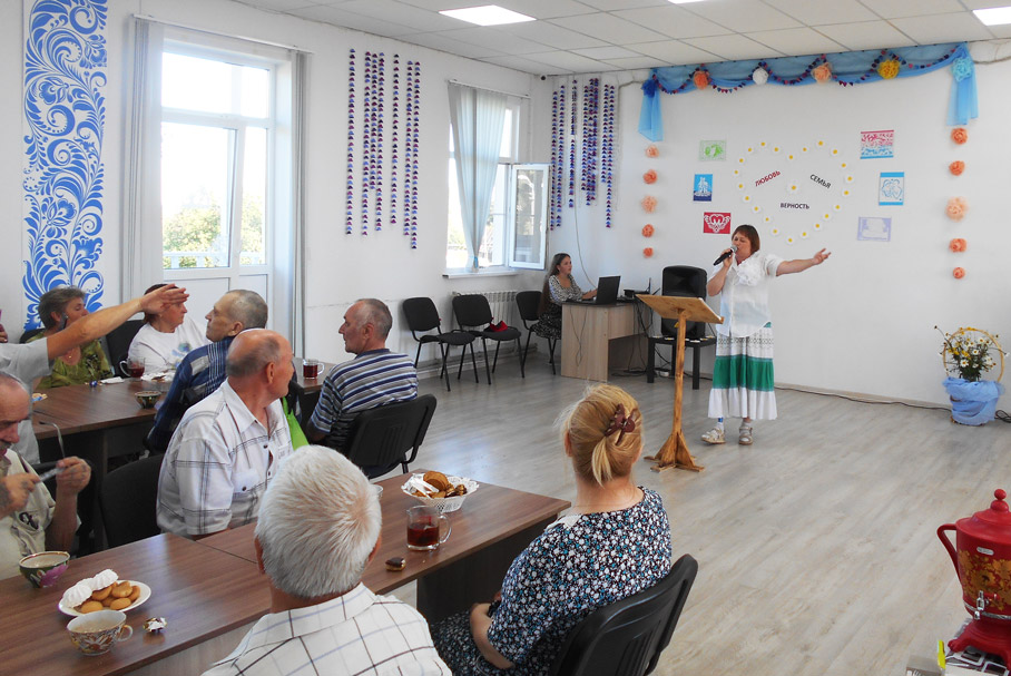 В этом году для проведения Дня семьи, любви и верности решили выбрать формат «концертных посиделок». Столы с традиционным красным самоваром Общественного центра, новым чайником, специально приобретённом по этому случаю, и угощениями расставили прямо в зрительном зале, чтобы гости не стеснялись, наливали чай прямо во время выступлений. Артистам это не мешало. Совсем наоборот, вдохновляло.