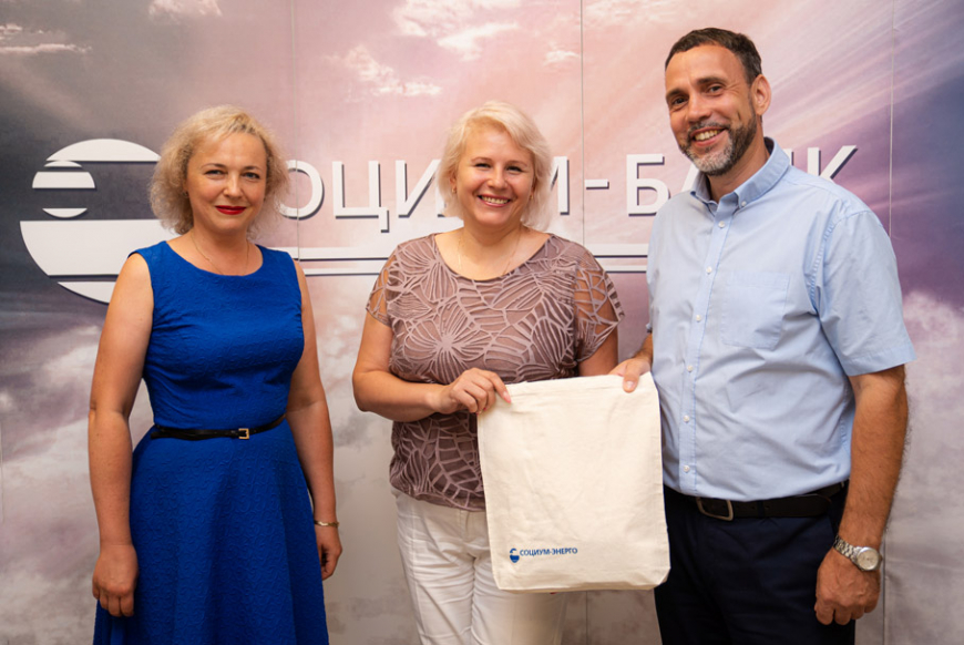 Генеральный директор «СОЦИУМ-ЭНЕРГО» Вячеслав Дереш лично пришёл в «СОЦИУМ-БАНК» наградить победительницу в сопровождении начальника отдела по работе с клиентами Светланы Спиридоновой. И принёс специальные призы. Это – дизайнерский сетевой светящийся разветвитель от студии Артемия Лебедева, куда можно подключить до 5 устройств (не просто розетка, а целый арт-объект), «энергетически подпитывающая» футболка и брендированный шопер от компании.