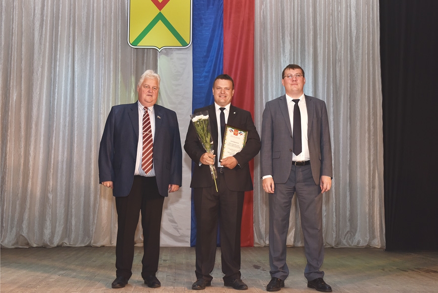 Торжественное вручение диплома за победу в городском конкурсе «Предприниматель года»: Игорь Плотичкин, председатель Арзамасской городской Думы шестого созыва, Денис Шмелёв, генеральный директор ООО «СОЦИУМ-ПОСЕЛЕНИЯ», Александр Щёлоков, мэр Арзамаса
