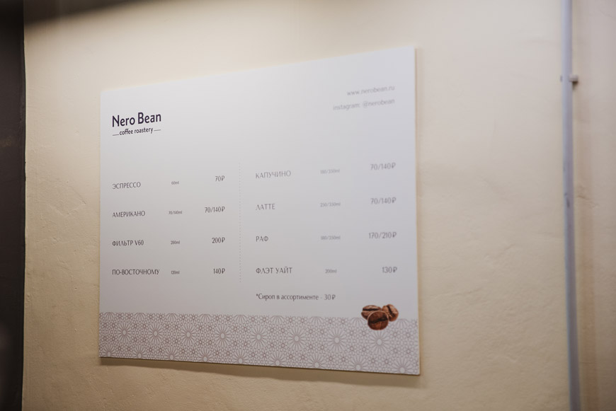Словом, попадаешь в необычный антураж кофейни-ростерной, которая вполне может стать модным местом встреч. Единственное неудобство: Nero Bean расположен не в проходной зоне, а в глубине квартала. Пройдя мимо спортивного клуба «Синергия», надо зайти в большие железные ворота, правее увидите большие окна и стеклянную дверь. Вам сюда – идите на запах свежеобжаренного и свежесваренного кофе. Он чудесен.