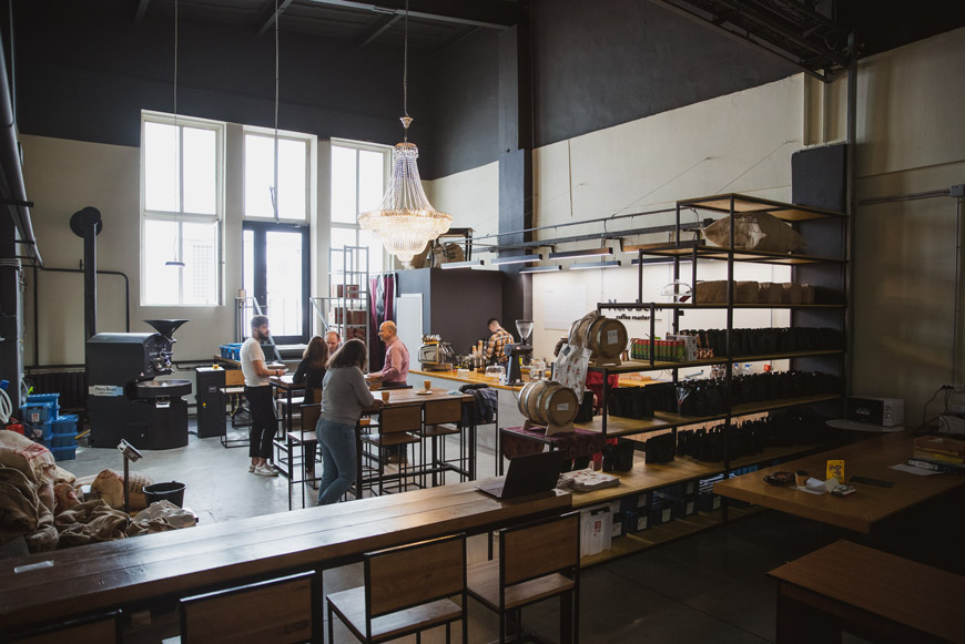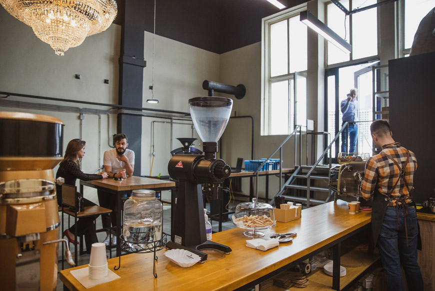 В интерьере кофейни сохранился индустриальный стиль производственного помещения: панорамные окна, высокие потолки, коммуникации, специально выведенные на стены, массивная мебель. На фоне этого контрастно и стильно смотрится большая хрустальная люстра. Света здесь много. Длинная барная стойка и пара столов напротив неё. Сидя за ними, удобно наблюдать за работой обжарочной машины, за тем, как в нее загружают зеленоватое кофейное зерно.