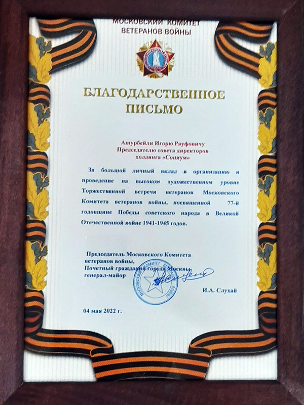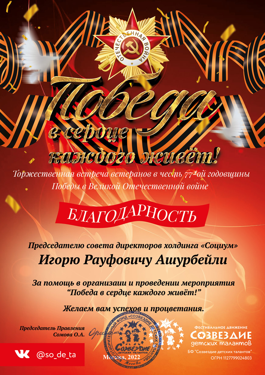 – Мы получили очень много положительных отзывов от наших дорогих ветеранов. Тем, что мероприятие, такое масштабное и душевное, состоялось, мы обязаны нашим благотворителям, – отметила президент фестивального движения «Созвездие детских талантов» Марина Зурабова. – В последнее время не так просто найти людей, которые готовы помогать материально и безвозмездно. Поэтому от имени всех организаторов и гостей я сердечно благодарю Игоря Рауфовича Ашурбейли и его холдинг «СОЦИУМ» за поддержку. Это благое дело!