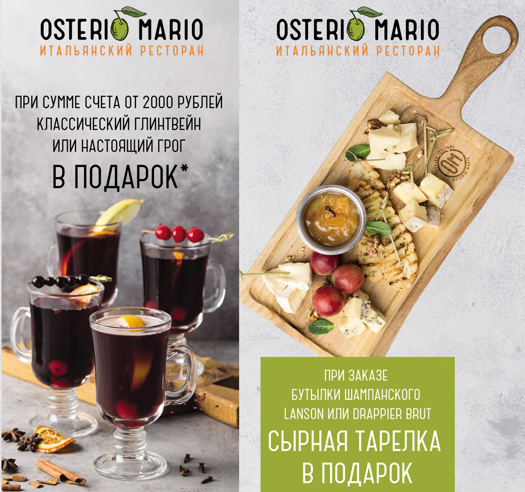 В ресторане Osteria Mario этой зимой гостей, как всегда, согревают очень вкусной едой, приятной атмосферой, а при чеке свыше 2000 рублей ещё и бесплатно угощают глинтвейном или грогом. Вторая акция – для гурманов: при заказе бутылки шампанского Lanson или Drappier Brut в подарок вам на столик принесут сырную тарелку.
