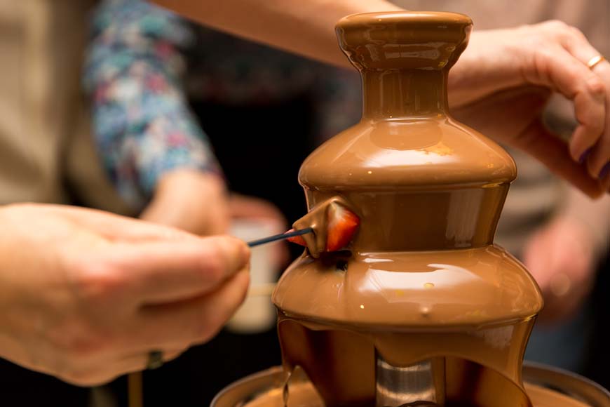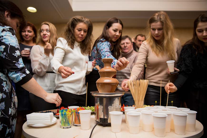 Свежие фрукты и шоколадное фондю зарядили хорошим настроением. И многие не стали отказывать себе в удовольствии сфотографироваться с огромной связкой воздушных шаров, влекущих в поднебесье.